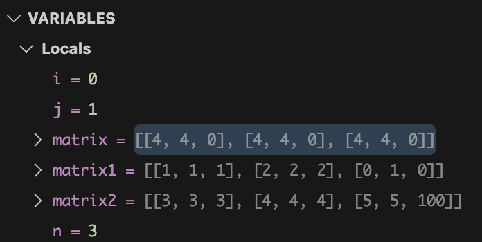 백준 문제를 풀다가 변수 matrix(행렬, 2차원 배열)가 값이 이상하게 할당되는 것을 조사식을 통해 확인했다.